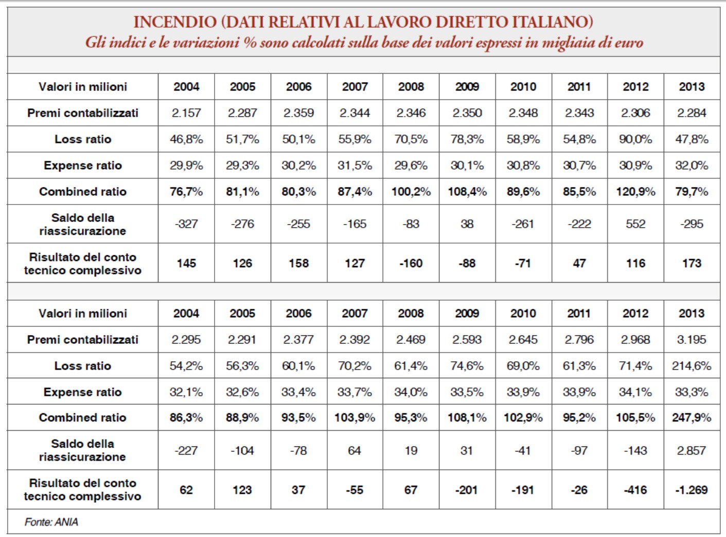 I premi contabilizzati sono riferiti al lavoro italiano diretto e, nel primo decennio, palesano una crescita assai modesta, passando da 2.157 milioni del 2004 a 2.284 milioni del 2013. Un incremento del 6%, in un decennio, che parrebbe la fotografia di un mercato assicurativo ormai saturo, nel quale, oltre a una stagnazione economica e a una sostanziale mancanza di inflazione, si accompagna la presenza del maggior numero possibile di coperture previste dal ramo incendio.